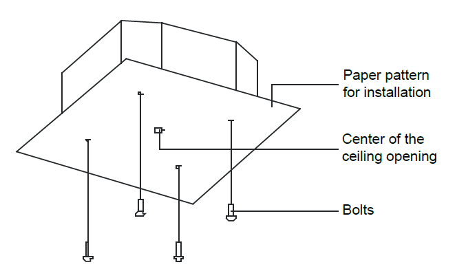 - New Home Installations: When installing the unit in a new home, the ceiling hooks can be embedded in advance. Make sure the hooks do not come loose due to concrete shrinkage. After installing the unit, fasten the installation paper template onto the unit with bolts to determine the dimensions and position of the ceiling opening. Follow the instructions above for the remainder of the installation.