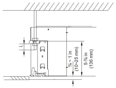 - The bottom of the unit should be 3/8 of an inch to 1 inch (10~25 mm) higher than the ceiling board. Generally, "L" (indicated in the following figure) should be half the length of the suspension bolt or long enough to prevent the nuts from coming off.
