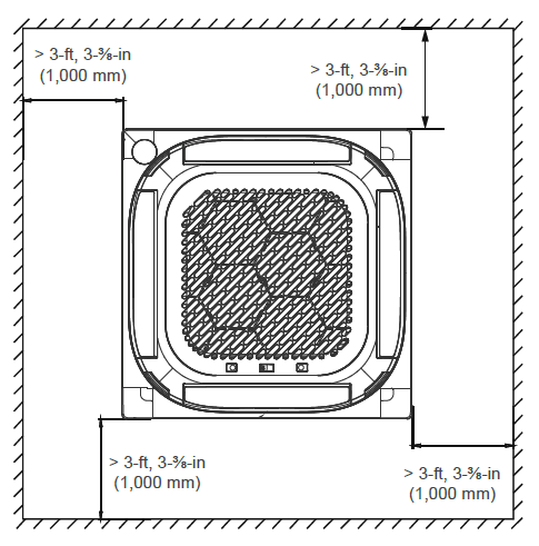 1. Use the included paper template to cut a rectangular hole in the ceiling, leaving at least 3-feet, 3-3/8 inches (1 m) on all sides. The cut hole size should be 16 inches (406.4 mm) larger than the body size.