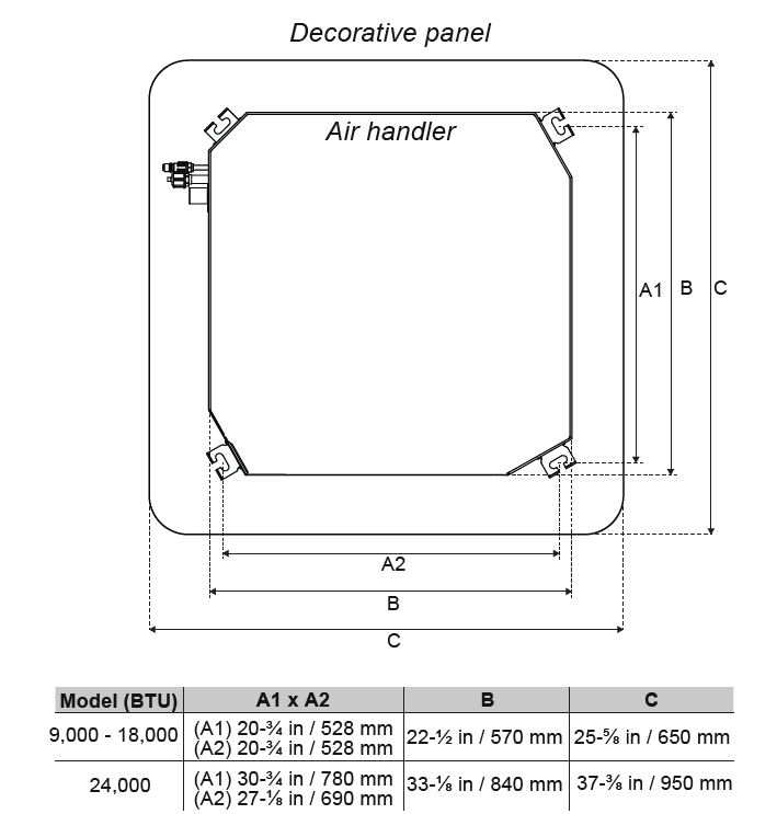 Before creating the opening, ensure that the ceiling can support the weight of the unit. If needed, consult a qualified professional for structural evaluations and specific guidance. For information on the dimensions and weights of the different ceiling cassette models, see this article.
