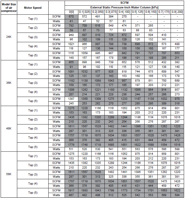 The highlighted areas in the table indicate the airflow is within the required range of 300-450cfm/ton.