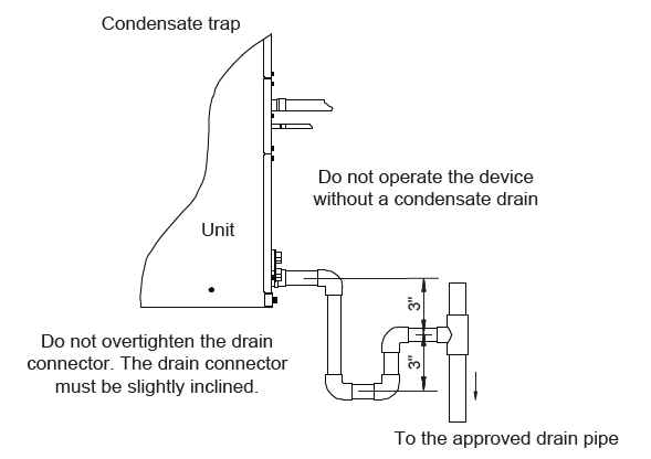 - Do not connect the condensate drain line to the closed or open sewage pipe. Drain the condensate to an open drainpipe or a safe outdoor area.