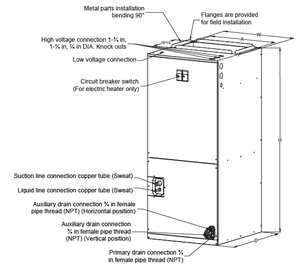 | Height "H" | Width "W" | Dimension "D" | Air Outlet "A" | Liquid Line / Suction Line | |