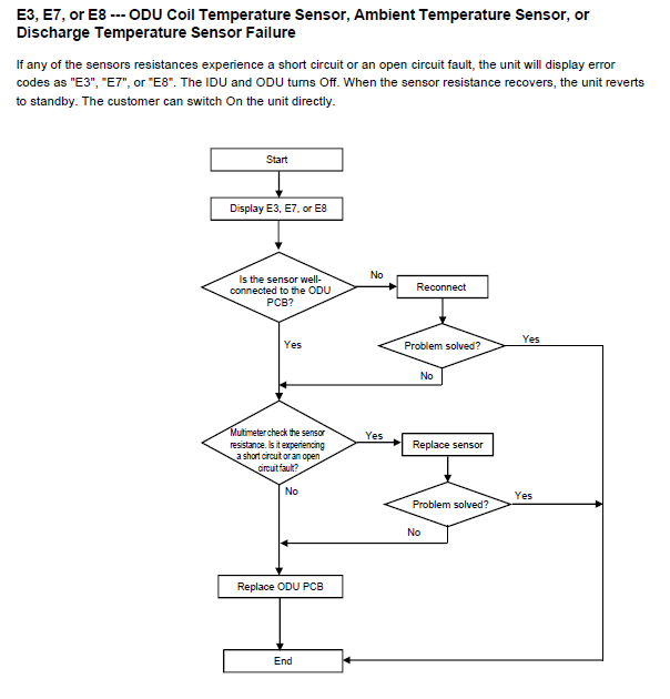 The "E3", "E7", or "E8" error codes indicate an outdoor unit coil temperature sensor failure, ambient temperature sensor failure, or discharge temperature sensor failure.