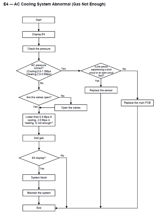 E4 error codeUpdated an hour agoIntroductionThe "E4" error code indicates the AC cooling system is operating abnormally. This error may occur if the system does not have enough gas. The error code is for Diamante series systems. Troubleshooting Diagram Was this article helpful? YesNoE4 error codeIntroductionTroubleshooting Diagram