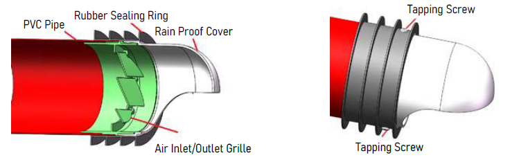 - EA side: PVC pipe + Air outlet grille + Rain proof cover + Rubber sealing ring + Tapping screws