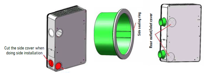 8. Cover up the side air inlet and side outlet by placing the two round outdoor air and exhaust air covers on them.