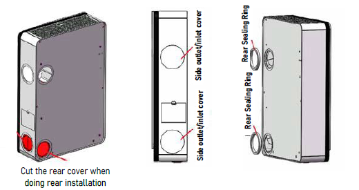 When drilling outlet holes on the wall, the opening hole size is only a recommended value. For the side installation scenario, the ducts should be flexible ducts (field supplied by the installer). The final hole size on the wall should be selected by the installer, according to the diameter of the duct being used.
