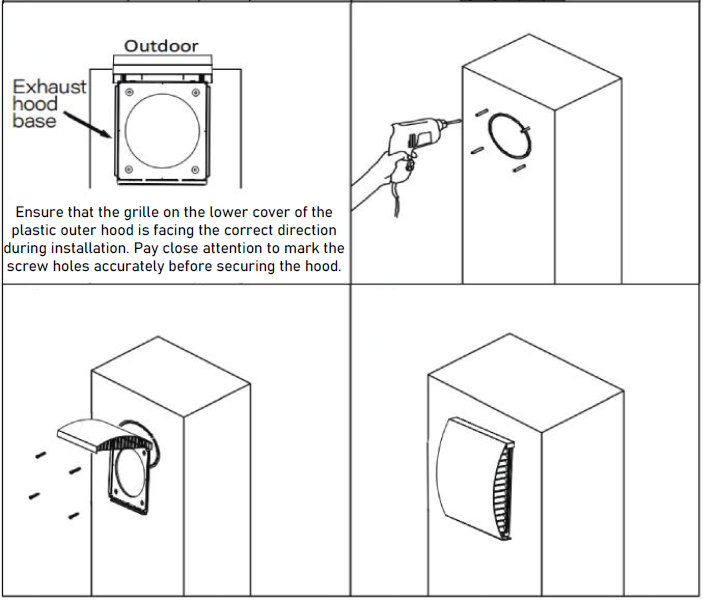 On the outside of the wall, mark the positions for the four screw holes on the base of the exhaust hood.