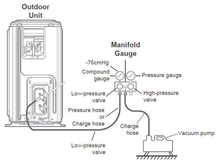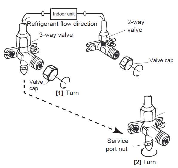 This article explains how to evacuate the air conditioner's refrigerant circuit.