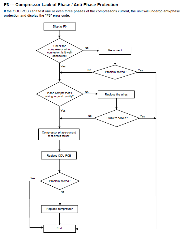 If the outdoor unit's printed circuit board (PCB) cannot test one or even three phases of the compressor's current, the system will undergo anti-phase protection and display the error code.