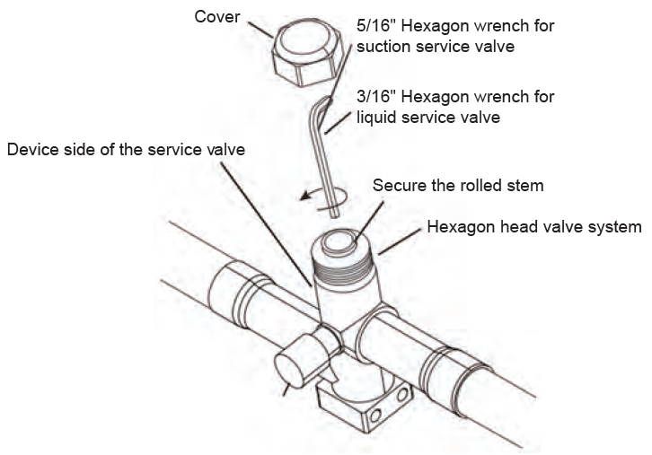 - Repeat steps 1-3 for the liquid service valve. Use caution when opening the liquid service valve.