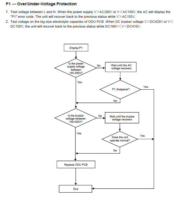 The "P1" error code indicates the system is undergoing over-voltage or under-voltage protection. The error code is for Diamante series systems.