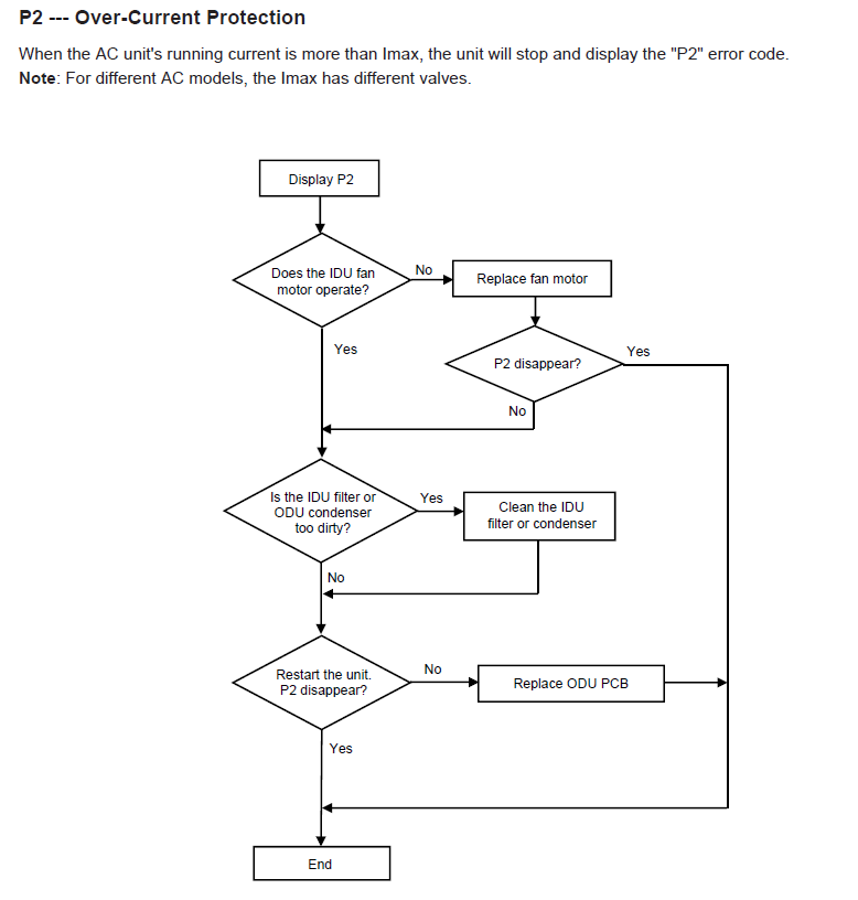 The "P2" error code indicates the system is undergoing over-current protection. The error code is for Diamante series systems.
