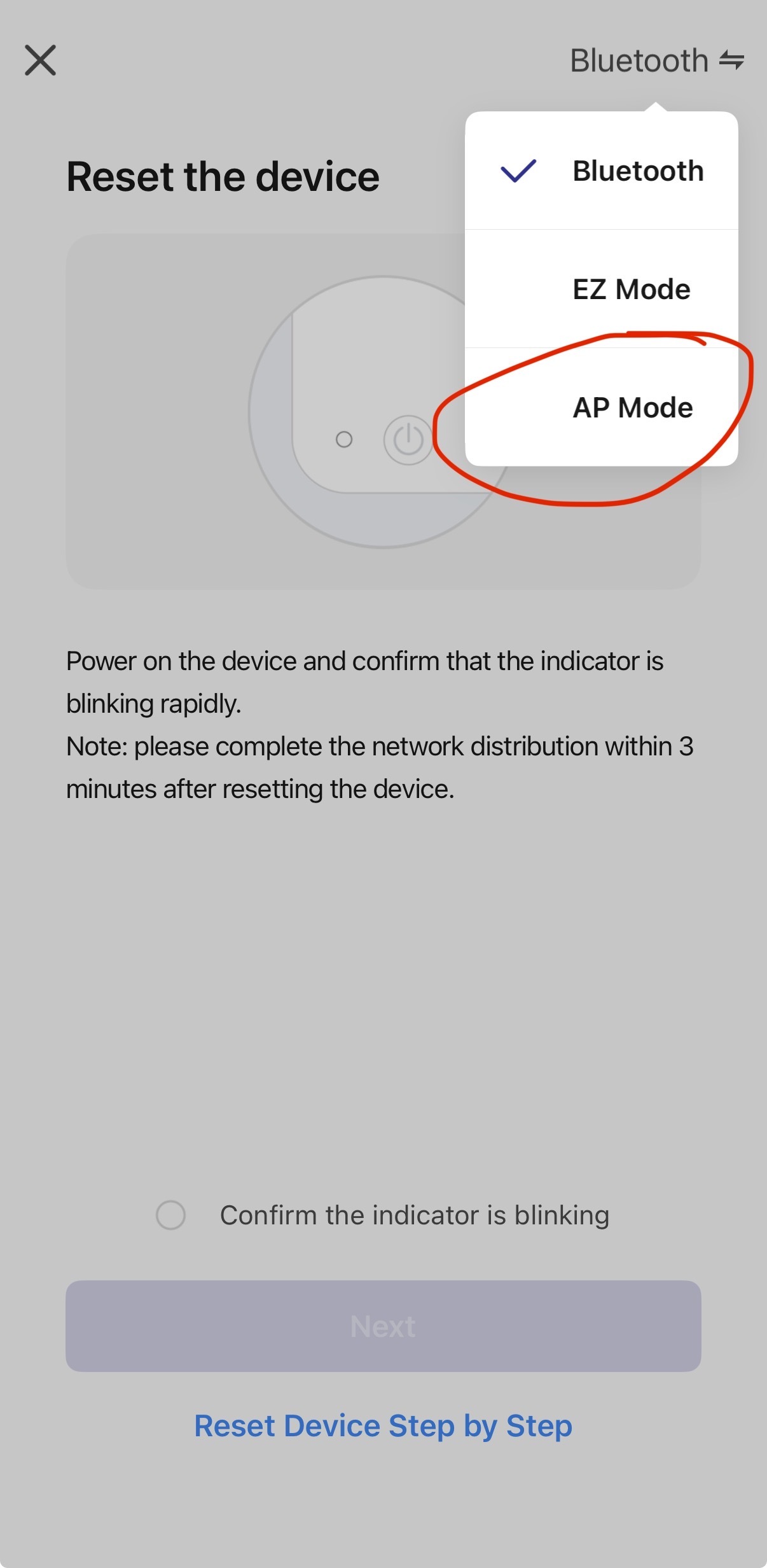 On the Reset the Device screen, tap the drop-down menu in the top-right corner and select AP Mode.