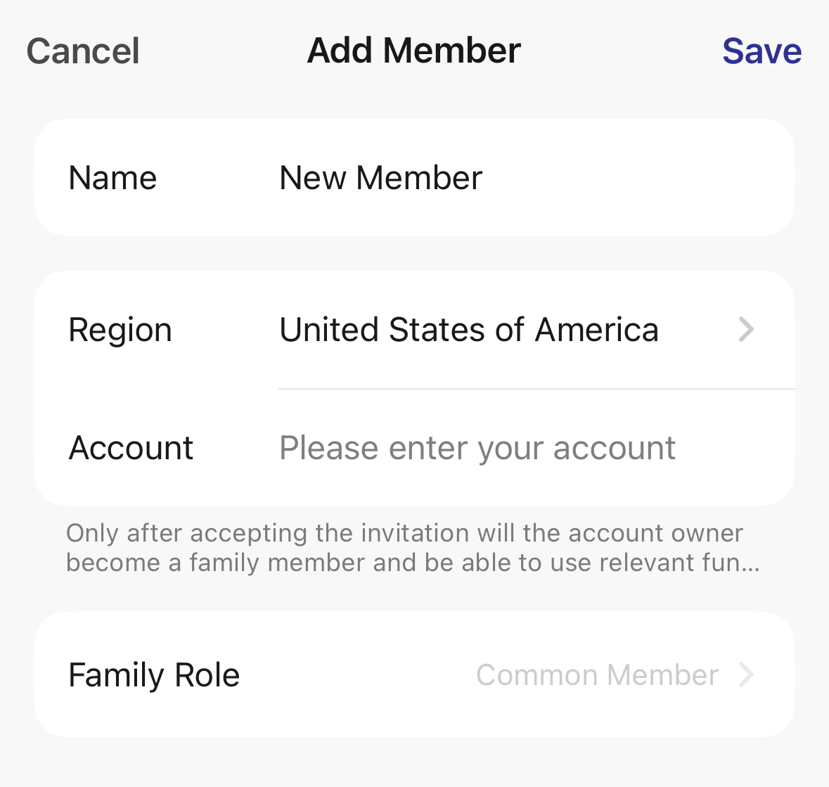 - Family Role: Select the role for the new member. By default, the app offers administrator and common member as the two available roles.