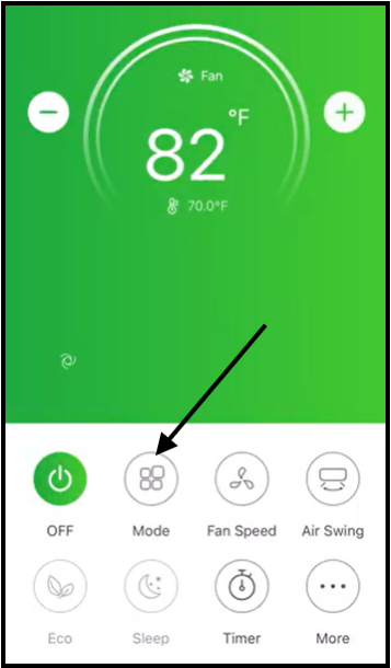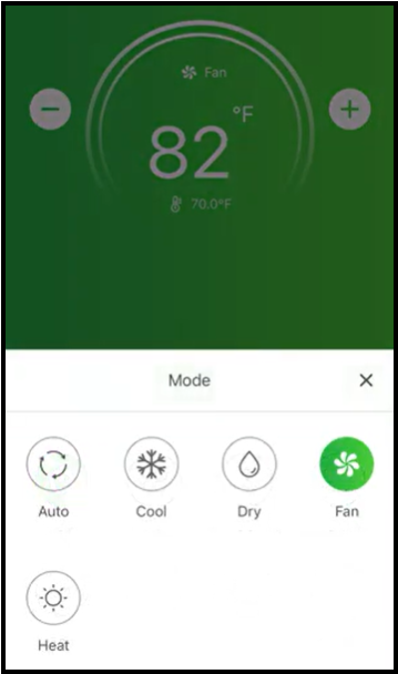 2. Select the desired working mode by tapping one of the options. There are five options available on the Mode screen: Cool, Heat, Dry, Fan, and Auto.