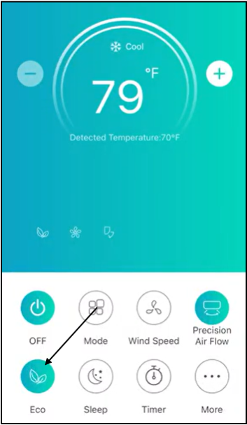 The Eco function is only available in Cooling and Heating mode. In Cooling mode, the new setting temperature is more than or equal to 79°F (26.1°C). In Heating mode, the new setting temperature is less than or equal to 77°F (25°C).
