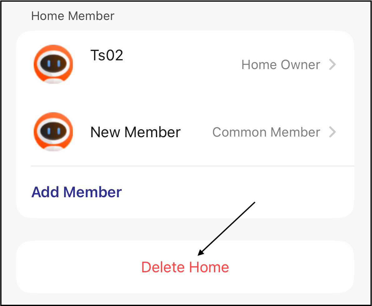 Existing homes can be deleted by tapping "Delete Home".