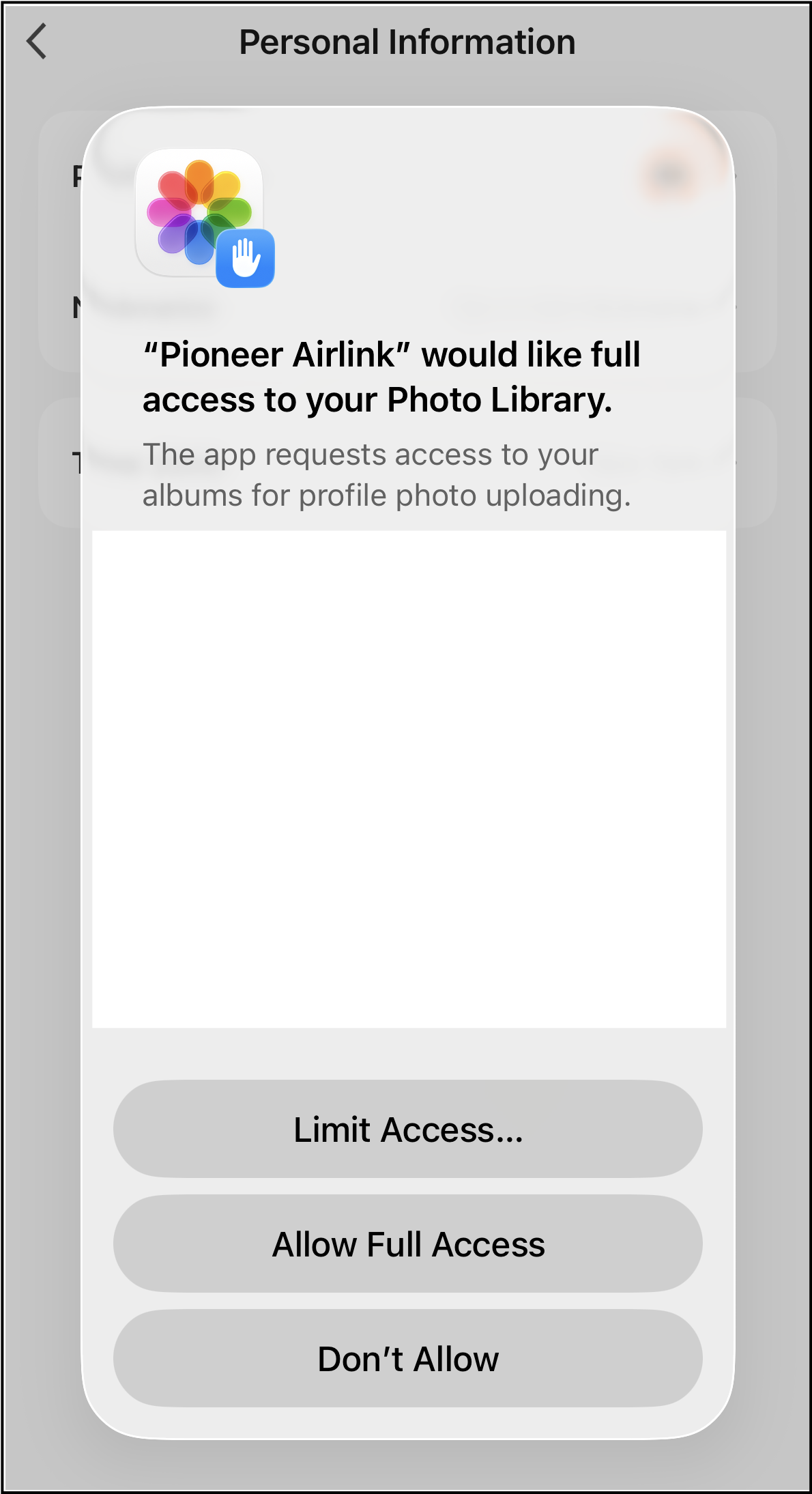 7. For first-time users, the Pioneer Airlink app will request access to the phone's photo library. Tap either "Limit Access" or "Allow Full Access" to allow the app to access photos stored on the phone.