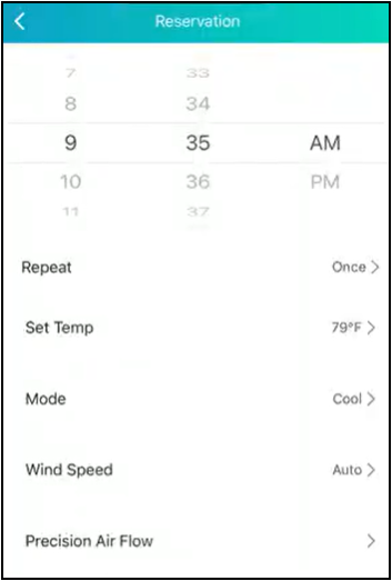 Users can create a reservation for their air conditioner, enabling the appliance to change its set temperature, mode, wind speed, and precision airflow at a specific time.