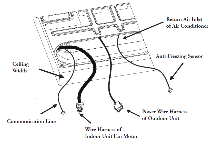 - Reach through the return air inlet of the air conditioner and pull down the wire harness of the outdoor unit to facilitate subsequent connections.
