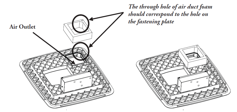 - Select the appropriate air duct foam thickness, remove the middle portion, and affix it to the fixing plate along the air outlet. Ensure that the holes on the foam align with the holes on the fastening plate.