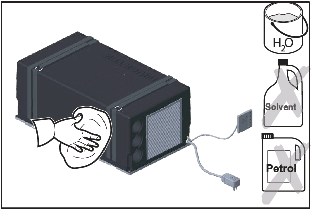 Use a soft and moist cloth to wipe down the surface area of the machine periodically in order to remove dust. If necessary, use clean water or a non-aggressive detergent.