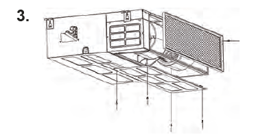 Loosen the screws to remove the mesh filter and filter frame from the bottom panel. Then, remove the back panel cover by loosening the mounting nuts.