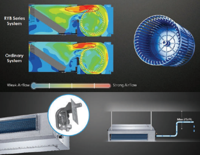 The air handler features an innovative blower wheel design, improving the airflow at the air outlet. This series includes a built-in drainage pump that can lift condensate water up to 30 feet (9.1 m).