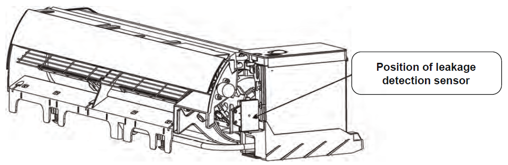 The auxiliary refrigerant leak sensor monitors the system operation. If refrigerant concentration exceeds the alarm threshold, the system will stop the compressor and start the circulation fan for safety.