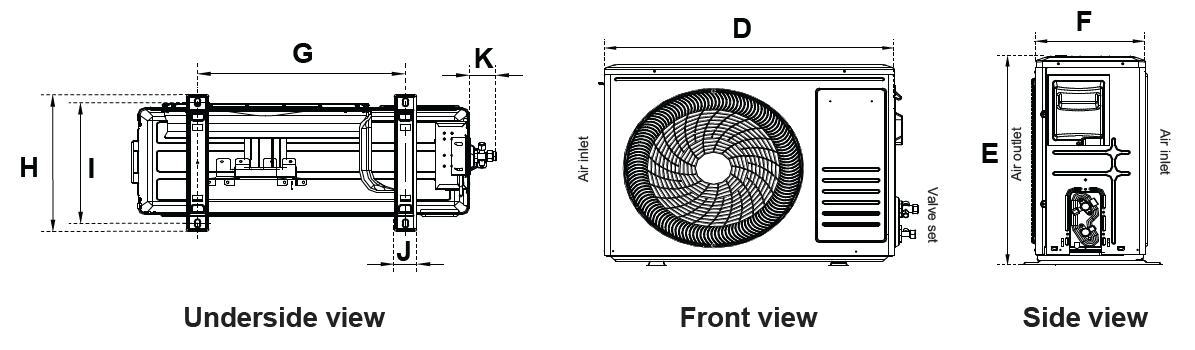Install the outdoor unit either on a pad or solid wall using suitable mounting brackets. The anchoring dimensions for the brackets vary per system. Refer to the section below for the anchoring dimensions.