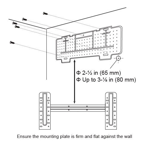 - Fix the mounting plate to the wall by using the included tapping screws. Check that it is secured.